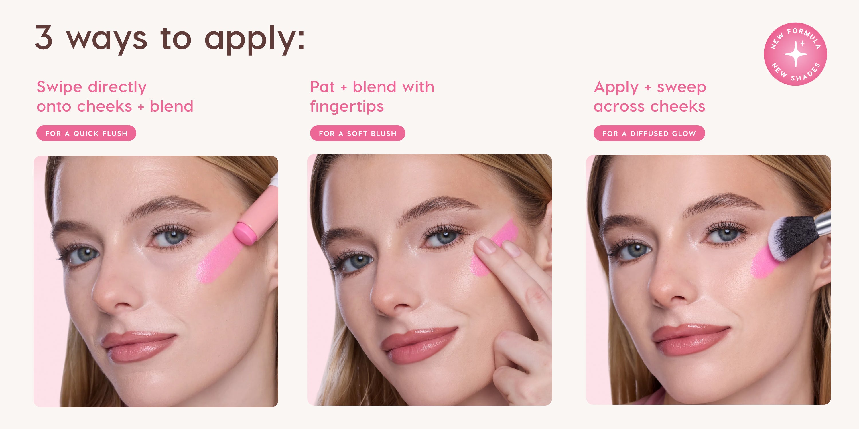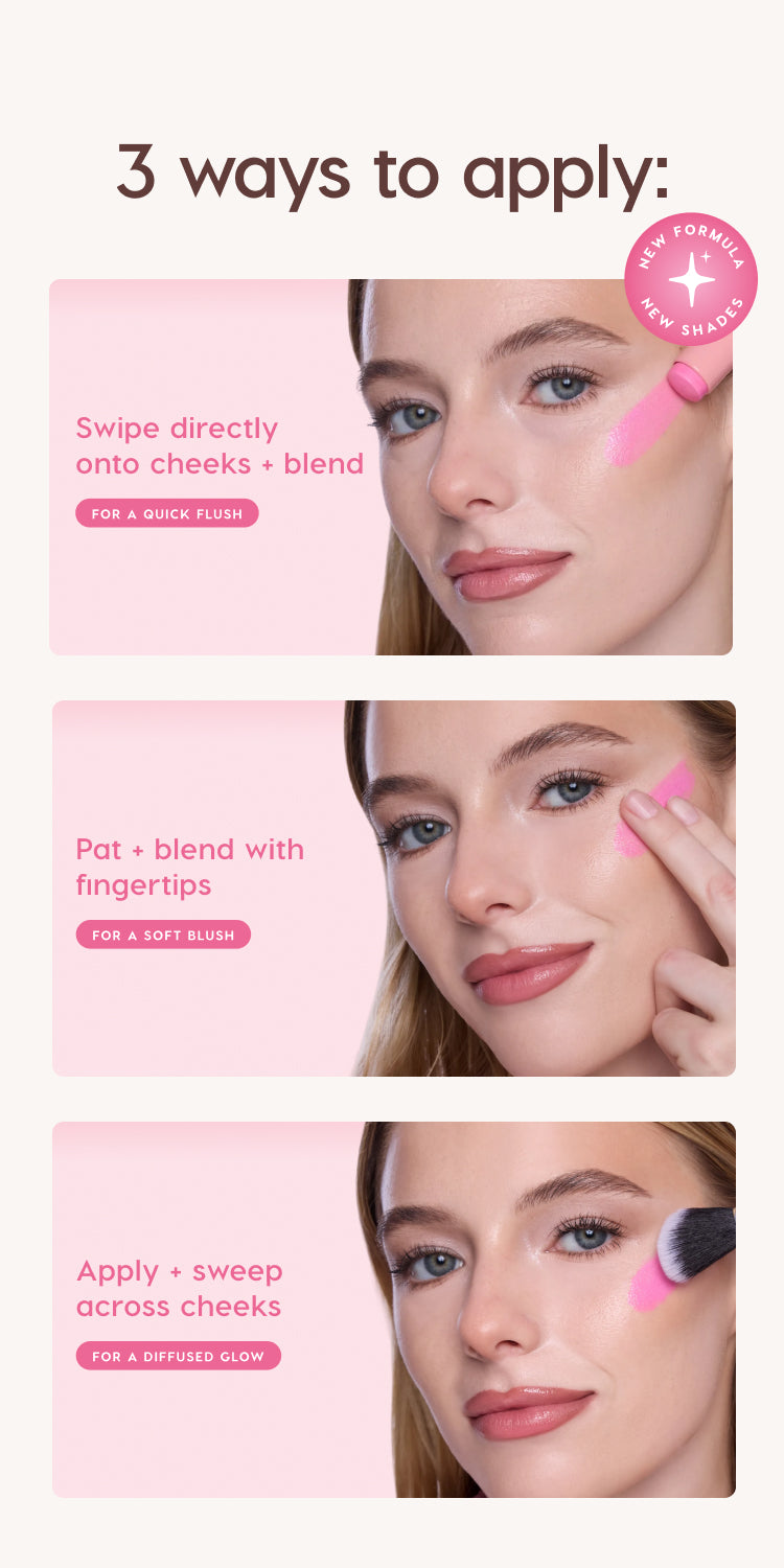 - Swipe directly onto cheeks and blend with fingertips, beauty sponge or brush.