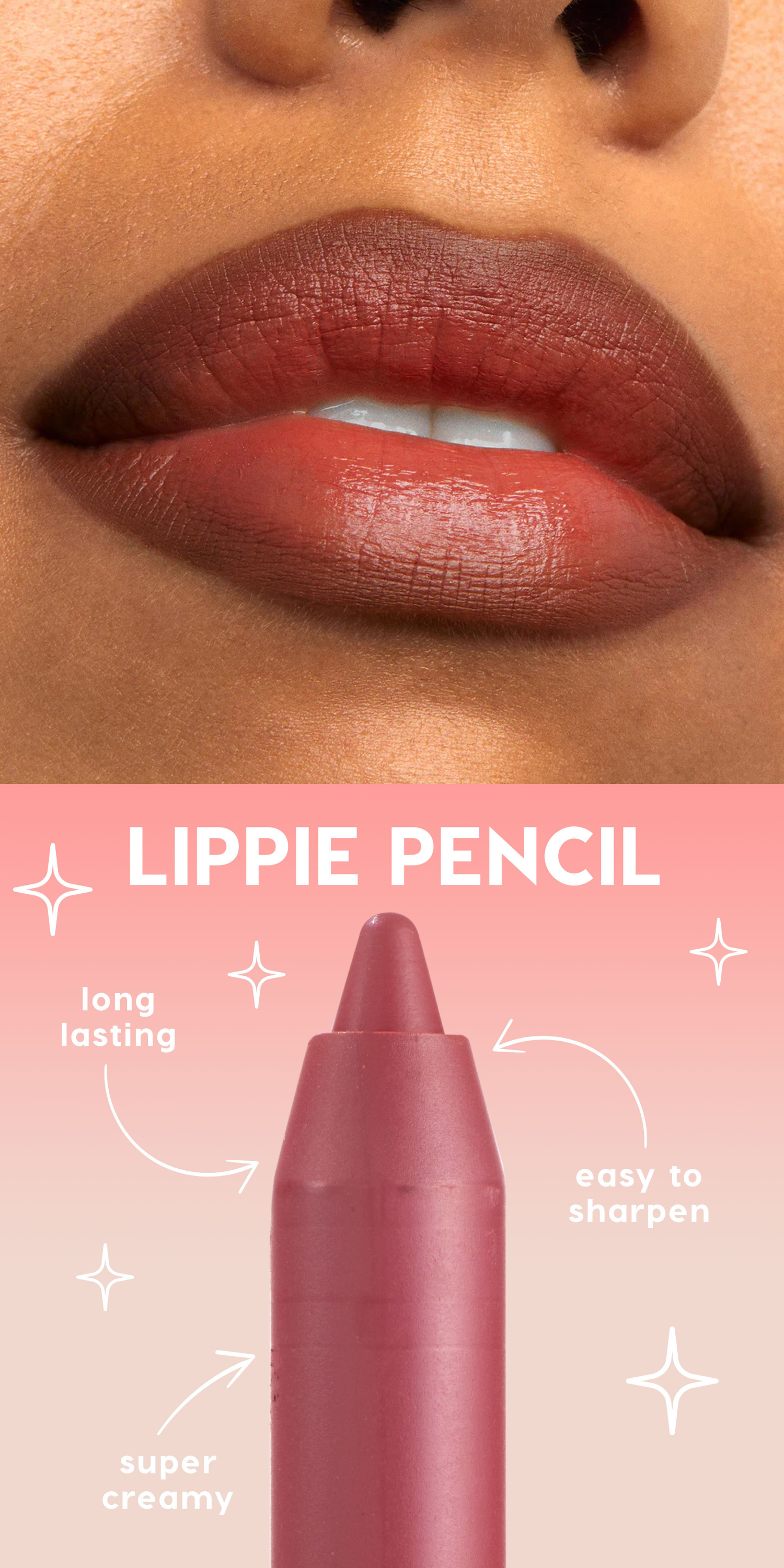 Our creamy, long-wearing Lippie Pencil glides on smooth to sculpt and shape with bold, high-pigment color. The precision tip makes it easy to define, overline, or wear solo for a quick, polished lip. Use it to keep your look clean, crisp, and feather-free or pair with your fave lipstick or gloss for a major lip moment.