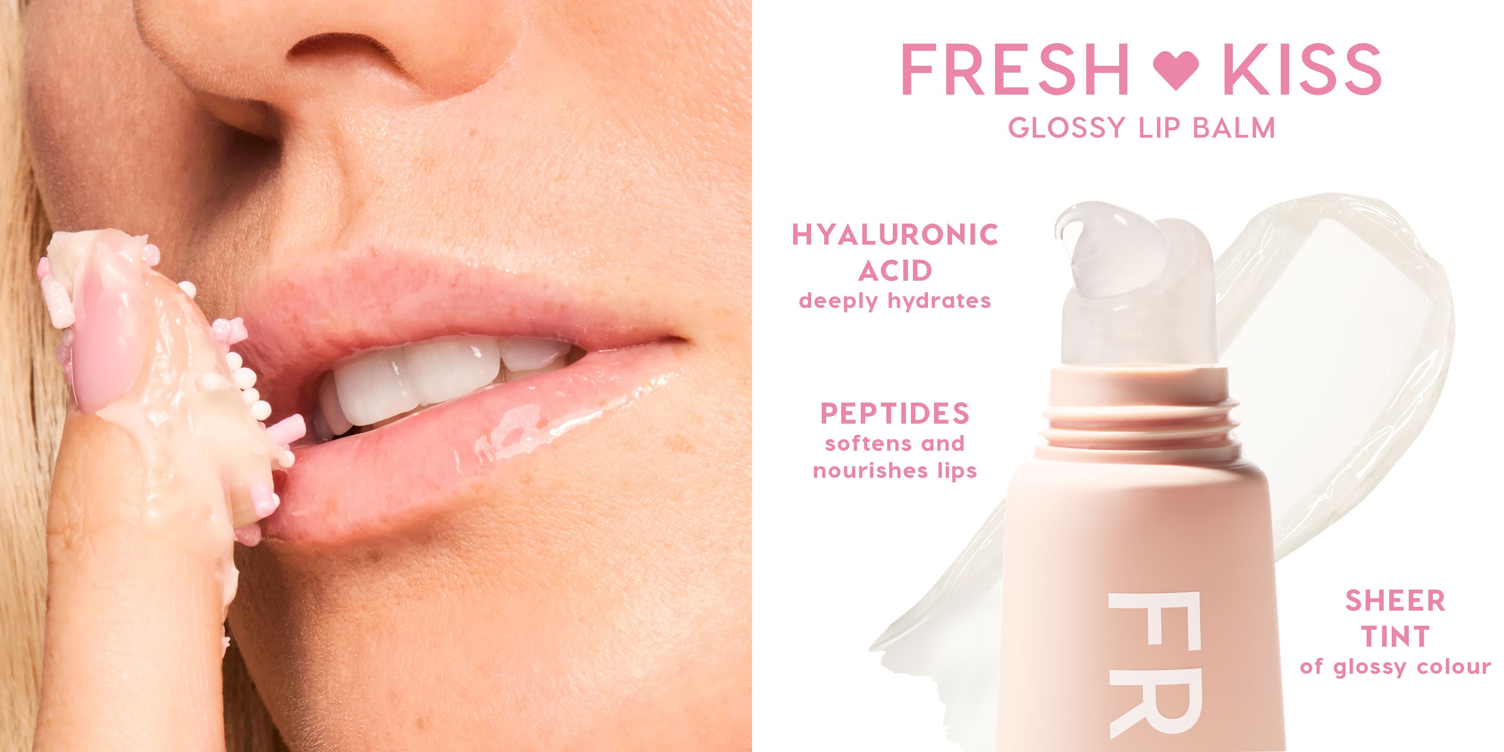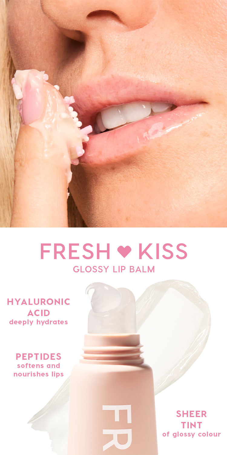 Treat your lips to something good. Yummy. Glossy. Hydrating. Our Fresh Kiss Glossy Lip Balm is infused with Peptides to soften and nourish lips and Hyaluronic Acid to deeply hydrate. The plush, ultra-cushiony formula drenches lips with a glossy finish and a hint of colour. Taste all 8 yummy flavors that smell as good as they feel.